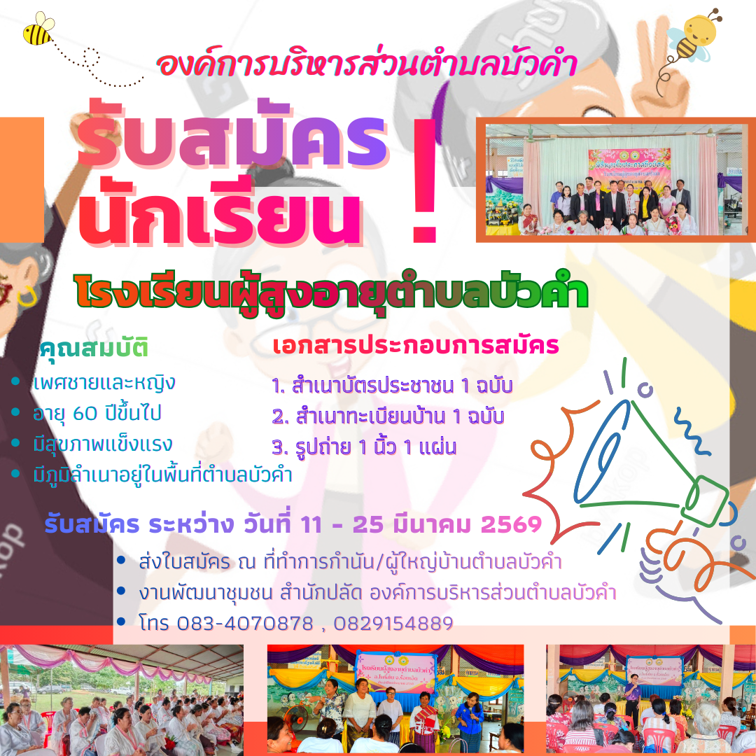 หัวข้อ :: องค์การบริหารส่วนตำบลบัวคำ ประกาศรับสมัครนักเรียนโรงเรียนผู้สูงอายุ ประจำปี พ.ศ.2569 รุ่นที่ 4 ระหว่างวันที่ 11 - 25 มีนาคม 2569 สามารถสมัครได้ที่ที่ทำการผู้ใหญ่บ้านแต่ละหมู่บ้านและองค์การบริหารส่วนตำบลบัวคำ งานพัฒนาชุมชน ในวันจันทร์ - วันศุกร์ เวลา 08.30 น.-16.30 น.